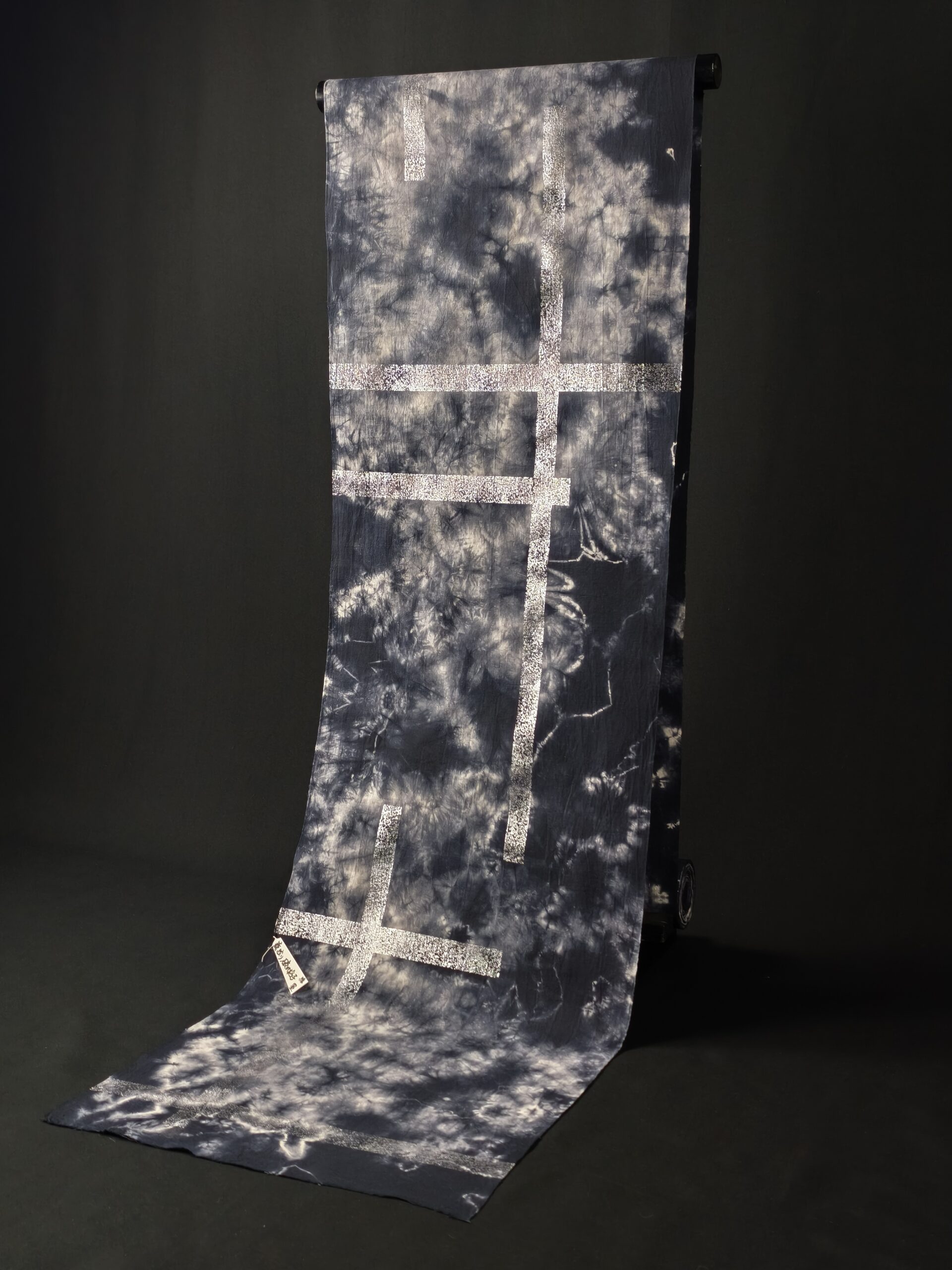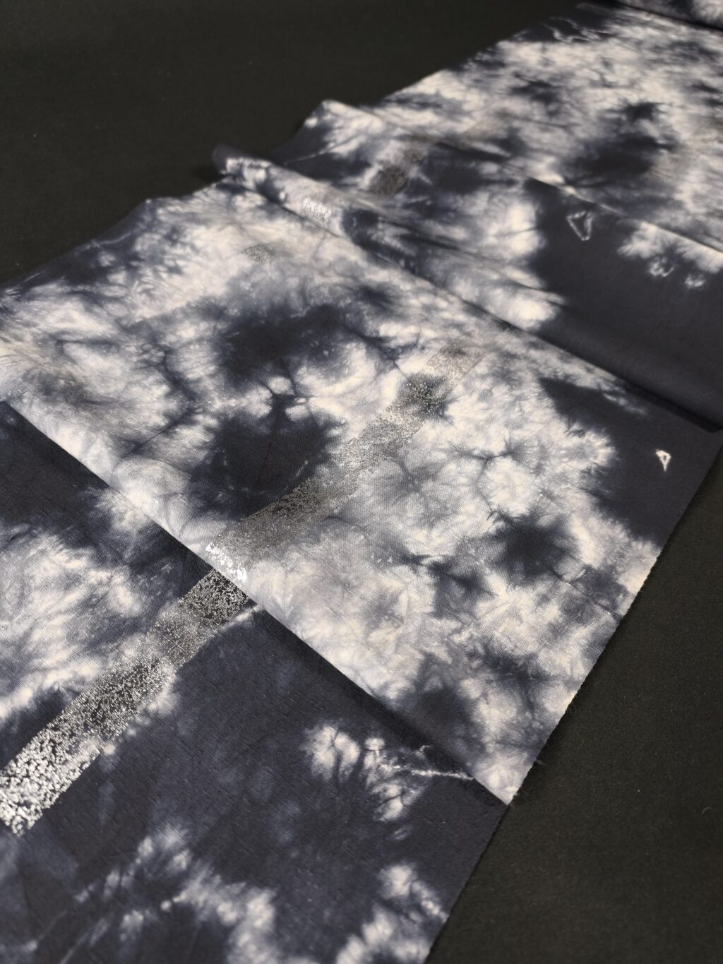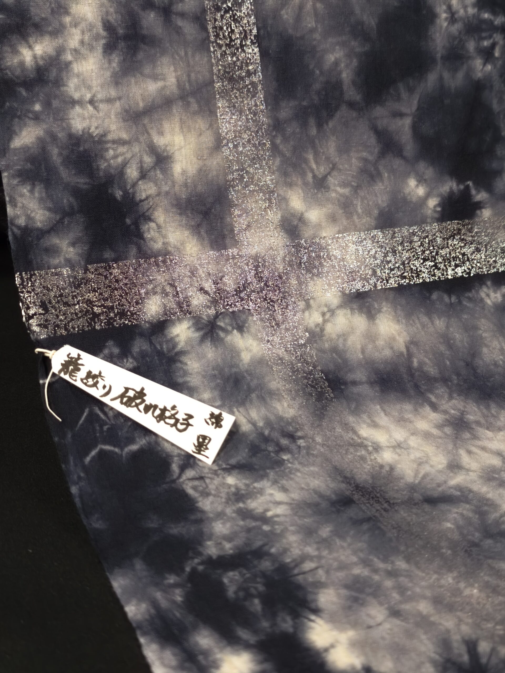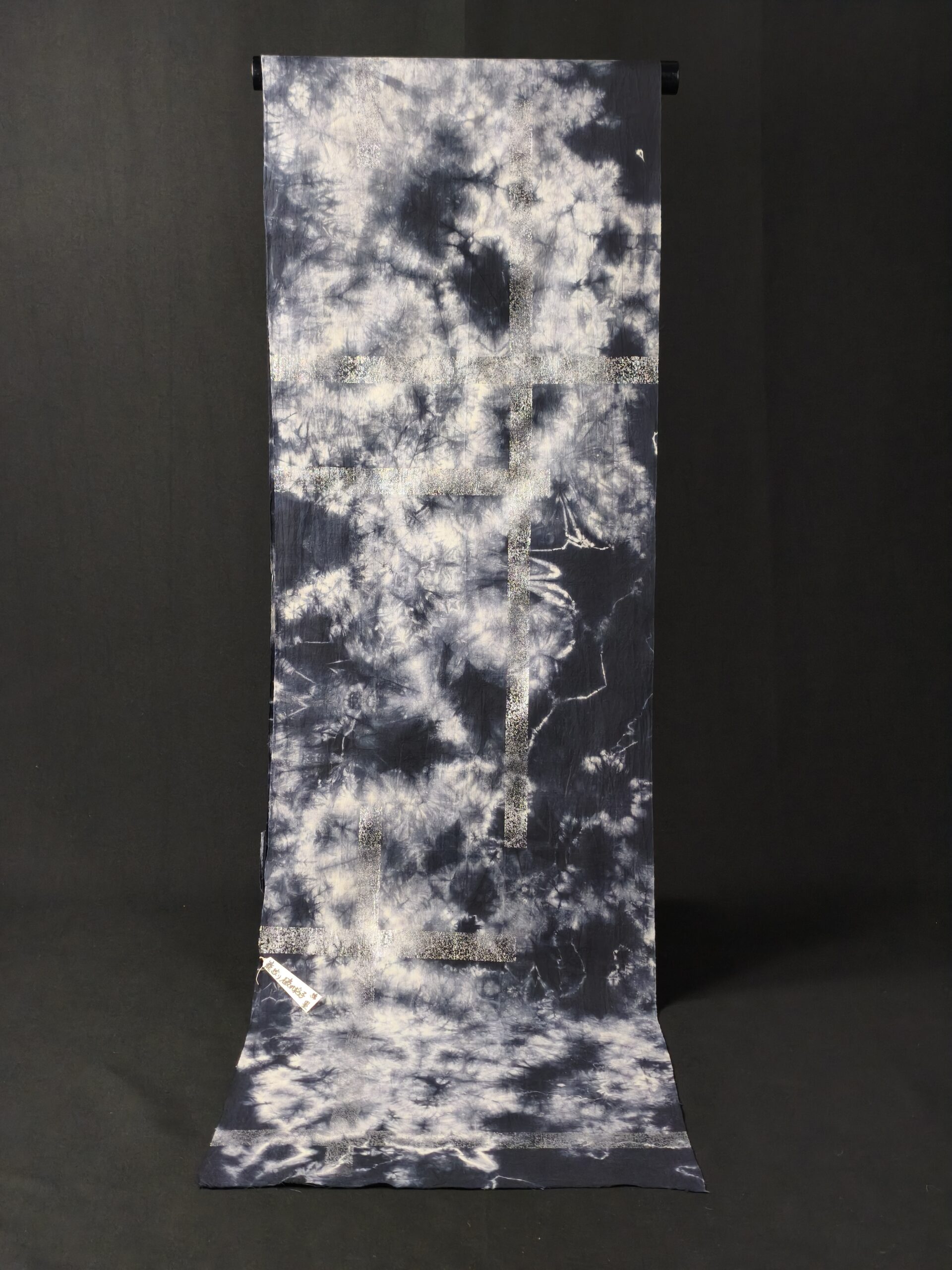 墨黒の籠絞りで染められた地に、銀箔で破れ格子が